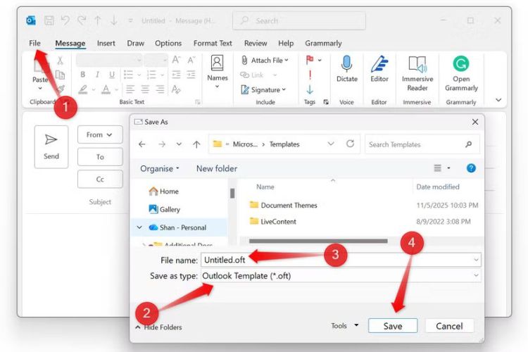 Để làm điều này, hãy soạn một email mới, vào File > Save As, mở menu "Save as Type" và chọn "Outlook Template", đặt tên cho mẫu và nhấn "Save".
