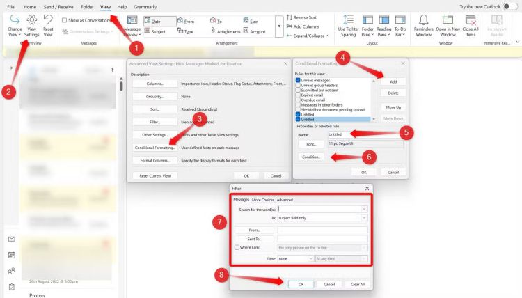 Bằng cách đánh dấu email khẩn cấp bằng màu đỏ, bạn có thể nhanh chóng tìm thấy chúng. Sau khi thiết lập các điều kiện, tất cả email đến sẽ tự động được mã hóa màu dựa trên các quy tắc bạn đã định nghĩa. Ví dụ, để mã hóa màu email từ một người gửi cụ thể, hãy vào tab "Xem", nhấp vào biểu tượng bánh răng "Cài đặt xem" và chọn "Định dạng có điều kiện" trong cửa sổ mới.