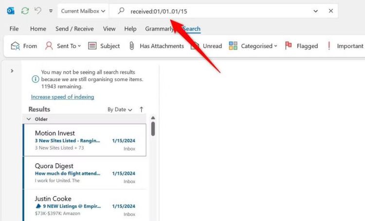 Ví dụ, sử dụng from:[email protected] hoặc to:[email protected] sẽ lọc các tin nhắn được gửi bởi hoặc đến một người cụ thể. Tương tự, hasattachments: chỉ hiển thị các email có tệp đính kèm, received:this month thu hẹp kết quả xuống các email được nhận trong tháng hiện tại và subject:meeting giúp bạn tìm các tin nhắn liên quan đến cuộc họp.