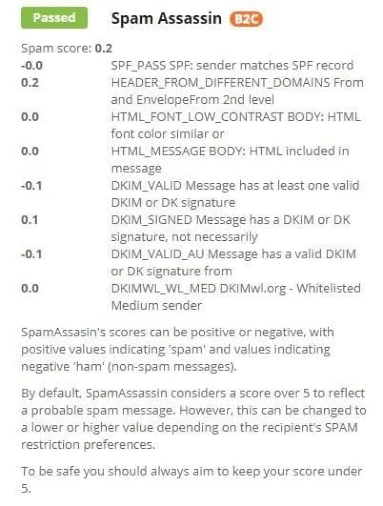 Mục tiêu của bạn với tư cách là một nhà tiếp thị qua email là giữ điểm của bạn dưới năm. Hãy xem đồ họa bên dưới để biết ví dụ về kết quả kiểm tra SpamAssassin trong nền tảng Email.