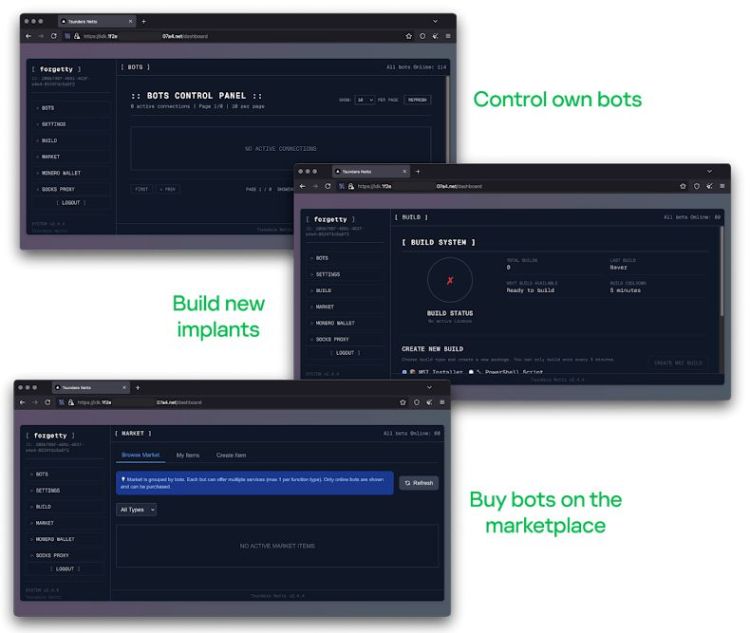 Hoạt động của botnet được hỗ trợ bởi một bảng điều khiển cho phép người dùng đã đăng nhập xây dựng các hiện vật mới bằng MSI hoặc PowerShell, quản lý các chức năng quản trị, xem số lượng bot tại bất kỳ thời điểm nào, biến bot của họ thành proxy để định tuyến lưu lượng truy cập độc hại và thậm chí duyệt và mua botnet thông qua một thị trường chuyên dụng.