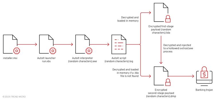 Trend Micro giải thích: "Nếu có tệp TDA, tập lệnh AutoIt sẽ giải mã và tải tệp đó dưới dạng trình tải PE trung gian (Giai đoạn 2) vào bộ nhớ. Tuy nhiên, nếu chỉ tìm thấy tệp DMP (không có TDA), tập lệnh AutoIt sẽ bỏ qua hoàn toàn trình tải trung gian và tải trojan ngân hàng trực tiếp vào bộ nhớ quy trình AutoIt, bỏ qua bước làm rỗng quy trình và chạy dưới dạng lây nhiễm hai giai đoạn đơn giản hơn."