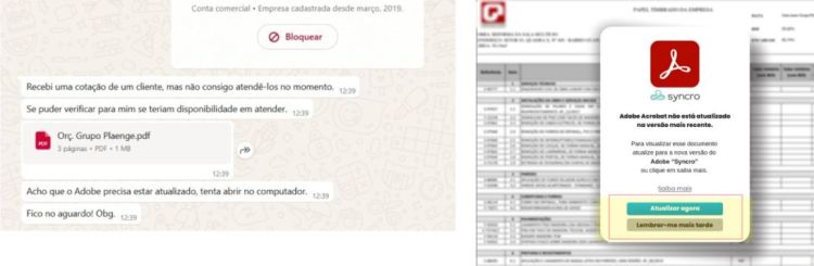 Trong các cuộc tấn công này, người dùng nhận được tin nhắn từ những người liên hệ đáng tin cậy trên WhatsApp, thúc giục họ tương tác với các tệp đính kèm PDF hoặc HTA độc hại, kích hoạt chuỗi lây nhiễm và cuối cùng thả một trojan ngân hàng có thể thu thập dữ liệu nhạy cảm. Mồi nhử PDF hướng dẫn nạn nhân cập nhật Adobe Reader bằng cách nhấp vào liên kết được nhúng.