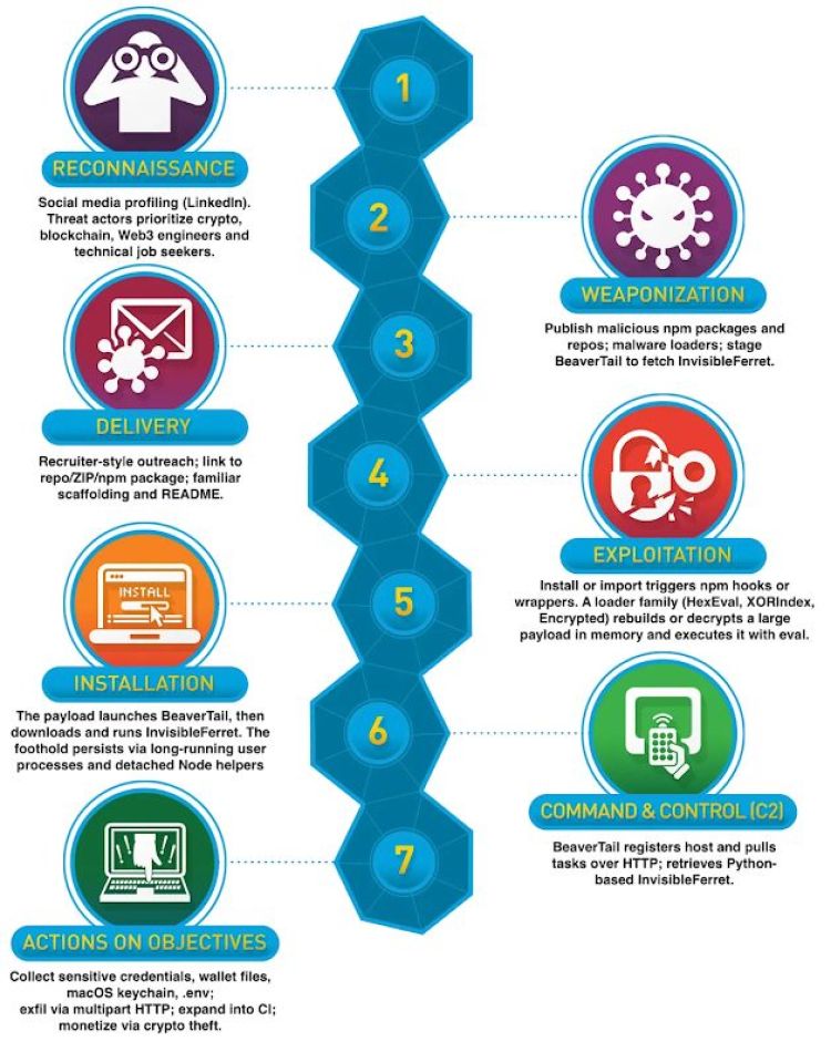Mục tiêu của chiến dịch bao gồm các nhà phát triển Web3, tiền điện tử và blockchain, cũng như những người tìm việc trong lĩnh vực kỹ thuật, những người được tiếp cận trên các nền tảng chuyên nghiệp như LinkedIn với những cơ hội việc làm hấp dẫn. Các mục tiêu tiềm năng sau đó được hướng dẫn hoàn thành bài tập lập trình bằng cách sao chép một kho lưu trữ bị cài bẫy, tham chiếu đến một gói độc hại (ví dụ: eslint-detector) đã được xuất bản lên sổ đăng ký npm.