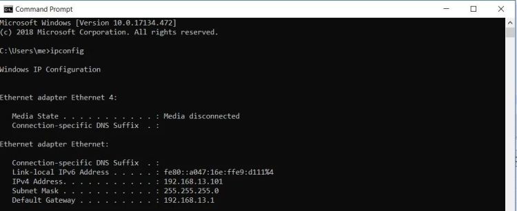 Bước 1: Tìm địa chỉ Giao thức Internet (IP) của bộ định tuyến. Để thực hiện việc này trên Windows, hãy nhấp vào menu Bắt đầu, nhập CMD và nhấp vào Enter. Trong cửa sổ xuất hiện, nhập ipconfig và nhấp vào Enter một lần nữa. Bạn sẽ thấy cùng một thứ như trong ảnh chụp màn hình bên dưới, mặc dù có các số địa chỉ khác nhau. Địa chỉ IP của bộ định tuyến của bạn sẽ được liệt kê là Cổng mặc định. Ở đây, đó là 192.168.13.1.