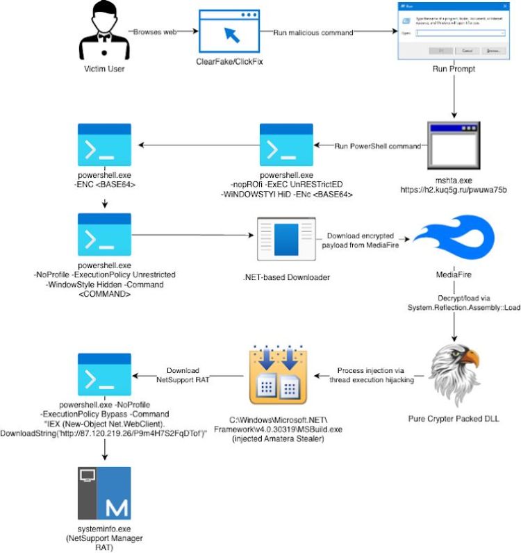 Tải trọng là DLL Amatera Stealer được đóng gói bằng PureCrypter, một trình mã hóa và tải đa chức năng dựa trên C#, cũng được quảng cáo là dịch vụ MaaS bởi một tác nhân đe dọa có tên PureCoder. DLL được đưa vào quy trình "MSBuild.exe", sau đó kẻ đánh cắp sẽ thu thập dữ liệu nhạy cảm và liên hệ với máy chủ bên ngoài để thực thi lệnh PowerShell nhằm tìm nạp và chạy NetSupport RAT.