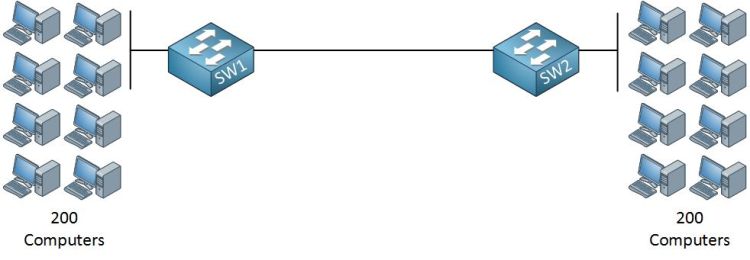 Chúng tôi có hai bộ chuyển mạch và mỗi bộ chuyển mạch kết nối 200 máy tính. Bây giờ, nếu tất cả 400 máy tính muốn giao tiếp với mỗi bộ chuyển mạch, chúng phải học 400 địa chỉ MAC. Chúng cần biết địa chỉ MAC của các máy tính bên trái và bên phải.