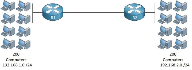 Những gì chúng ta có ở đây là 200 máy tính bên trái được kết nối với R1 và trong mạng 192.168.1.0 /24. R2 có 200 máy tính phía sau, và mạng chúng ta sử dụng ở đó là 192.168.2.0 /24. Bộ định tuyến "định tuyến" dựa trên thông tin IP. Trong ví dụ của chúng ta, R1 chỉ cần biết rằng mạng 192.168.2.0 /24 nằm sau R2. R2 chỉ cần biết rằng mạng 192.168.1.0 /24 nằm sau R1. Bạn có theo kịp tôi không?