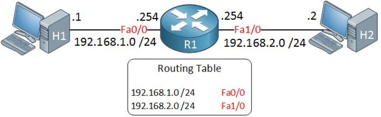 Trên bộ định tuyến của chúng tôi, chúng tôi đã cấu hình địa chỉ IP 192.168.1.254 trên giao diện FastEthernet 0/0 và địa chỉ IP 192.168.2.254 trên giao diện FastEthernet 1/0.