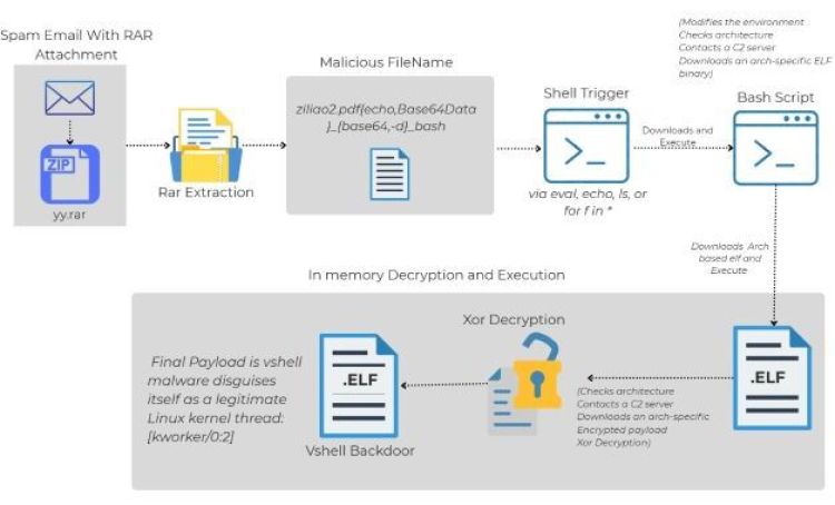 "Phân tích này nêu bật một sự phát triển nguy hiểm trong việc phát tán phần mềm độc hại Linux, nơi một tên tệp đơn giản được nhúng trong kho lưu trữ RAR có thể được sử dụng để thực thi các lệnh tùy ý", Trellix cho biết. "Chuỗi lây nhiễm khai thác việc tiêm lệnh trong các vòng lặp shell, lạm dụng môi trường thực thi cho phép của Linux và cuối cùng phát tán phần mềm độc hại VShell cửa hậu mạnh mẽ, có khả năng điều khiển toàn bộ hệ thống từ xa."