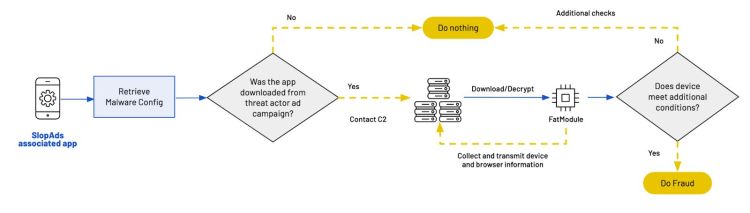 Hành vi gian lận chỉ được kích hoạt trong trường hợp ứng dụng được tải xuống sau khi nhấp vào quảng cáo, khiến ứng dụng tải xuống mô-đun gian lận quảng cáo FatModule từ máy chủ C2. Mặt khác, nếu ứng dụng đã được cài đặt ban đầu, ứng dụng sẽ hoạt động như quảng cáo trên trang cửa hàng ứng dụng.