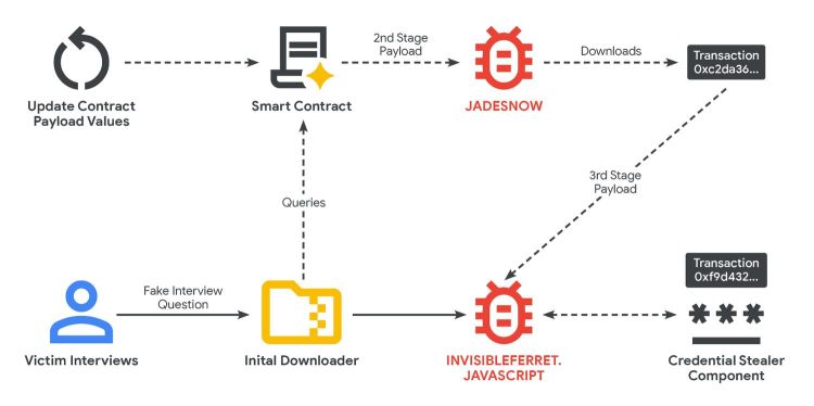 Nói một cách ngắn gọn, cuộc tấn công dụ nạn nhân chạy mã thực thi trình tải xuống JavaScript ban đầu tương tác với hợp đồng thông minh BSC độc hại để tải xuống JADESNOW, sau đó truy vấn lịch sử giao dịch liên quan đến địa chỉ Ethereum để lấy tải trọng giai đoạn thứ ba, trong trường hợp này là phiên bản JavaScript của InvisibleFerret.