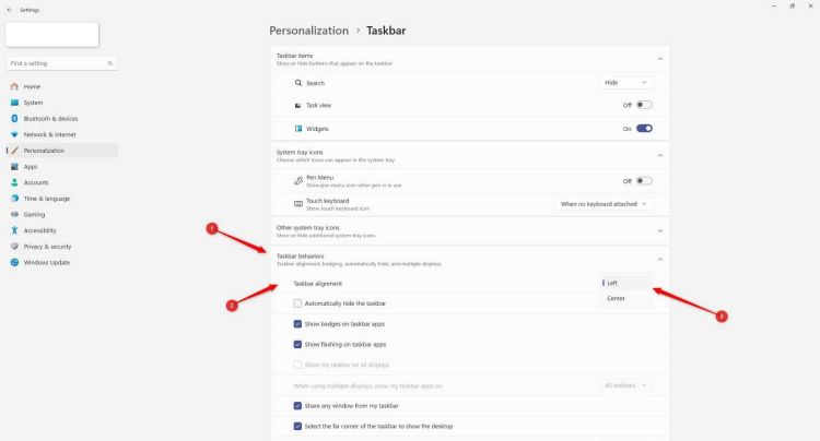 Để di chuyển Start Menu sang bên trái, hãy vào Settings > Personalization > Taskbar. Nhấp vào "Taskbar Behaviors." Nhấp vào "Taskbar Alignment" và chọn "Left" thay vì "Center."