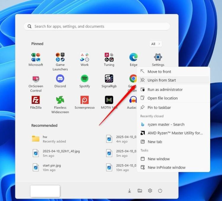 Windows 11 đã có một loạt các ứng dụng được ghim mặc định thay đổi tùy theo phiên bản Windows 11, khu vực, nhà sản xuất thiết bị của bạn, v.v. Nếu bạn không cần ứng dụng hoặc chỉ muốn tạo thêm không gian cho các ứng dụng của mình, hãy bỏ ghim ứng dụng bằng cách nhấp chuột phải vào ứng dụng và chọn "Bỏ ghim khỏi màn hình bắt đầu".