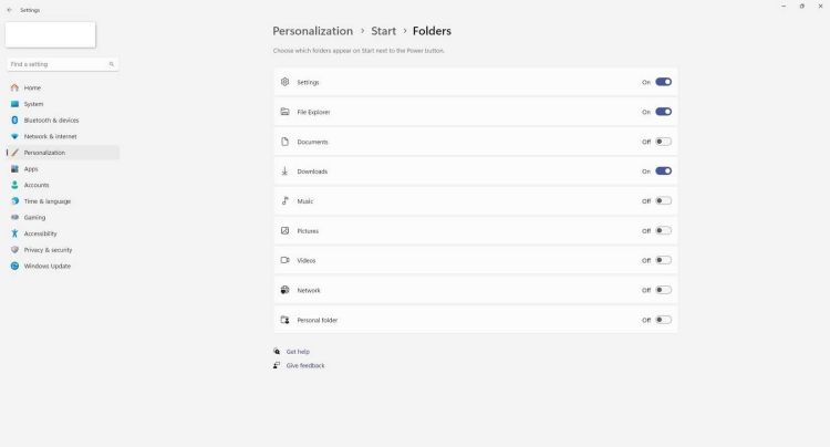 Để cấu hình các phím tắt nào sẽ xuất hiện trong phần này của Menu Bắt đầu, hãy điều hướng đến Cài đặt > Cá nhân hóa > Bắt đầu > Thư mục. Từ đây, hãy chọn thư mục bạn muốn.