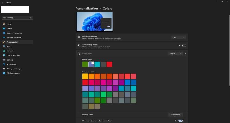 Nếu bạn thích chế độ tối như tôi, tôi rất vui khi báo cáo rằng Menu Bắt đầu của Windows 11 hỗ trợ chế độ này. Trên thực tế, bạn có thể chọn bất kỳ màu tùy chỉnh nào cho Menu Bắt đầu, mặc dù bạn cũng phải thay đổi thanh tác vụ thành cùng màu. Mở Cài đặt > Cá nhân hóa > Màu sắc. Trong Chọn chế độ của bạn, hãy chọn Sáng, Tối hoặc Tùy chỉnh để kết hợp cả hai.