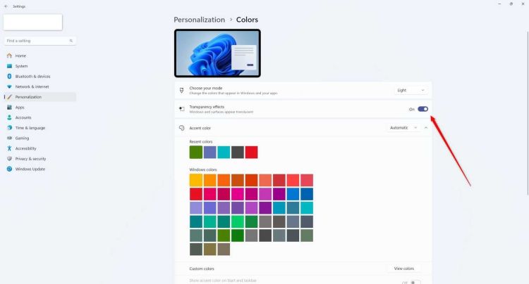 Để bật tính năng này, hãy vào Settings > Personalization > Colors. Bật "Transparency Effects" và bạn đã hoàn tất.