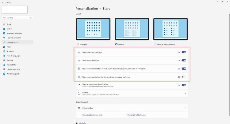 Theo mặc định, Menu Bắt đầu của Windows 11 được chia đều giữa các ứng dụng được ghim và được đề xuất. Cho dù bạn muốn có thêm không gian cho các ghim của mình hay nhiều đề xuất hơn, bạn có thể dễ dàng thay đổi bố cục. Truy cập Cài đặt (nhấn Windows+i) > Cá nhân hóa > Bắt đầu, sau đó chọn bố cục bạn muốn.