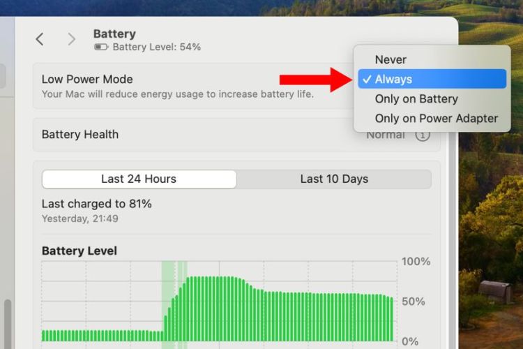 Để bật Chế độ Nguồn điện thấp trên MacBook của bạn, hãy vào Cài đặt > Pin và nhấp vào menu thả xuống như trong ảnh chụp màn hình. Nếu bạn đang sử dụng MacBook cũ có tình trạng pin yếu (dưới 80%), hãy cân nhắc đặt Chế độ Nguồn điện thấp thành "Luôn luôn".