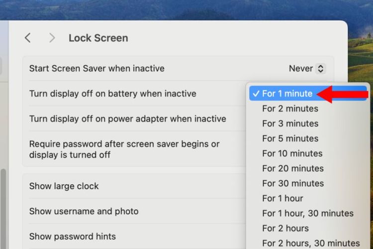 Để tối đa hóa thời lượng pin, đừng sử dụng trình bảo vệ màn hình trên MacBook vì nó giữ cho màn hình luôn hoạt động và liên tục tiêu thụ điện từ pin. Ngoài ra, hãy đặt thời gian chờ màn hình ở mức ngắn nhất có thể. Nếu bạn hỏi tôi, tôi giữ thời gian chờ màn hình ở mức một phút.
