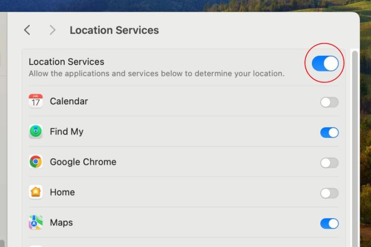 Để tắt dịch vụ định vị trên MacBook, hãy vào Cài đặt > Quyền riêng tư & Bảo mật > Dịch vụ định vị và nhấp vào nút chuyển đổi.