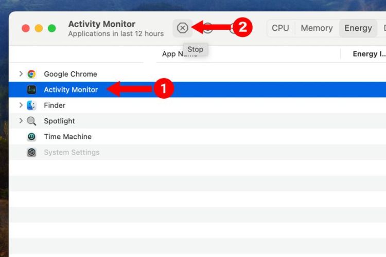 Bạn cũng có thể sử dụng Trình giám sát hoạt động để tìm các ứng dụng sử dụng nhiều năng lượng nhất, chọn chúng và nhấn nút chéo để đóng chúng.