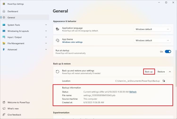 Sau khi bạn hoàn tất các bước, ứng dụng sẽ tạo bản sao lưu thiết lập PowerToys của bạn.