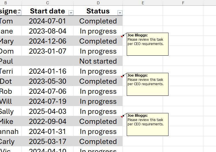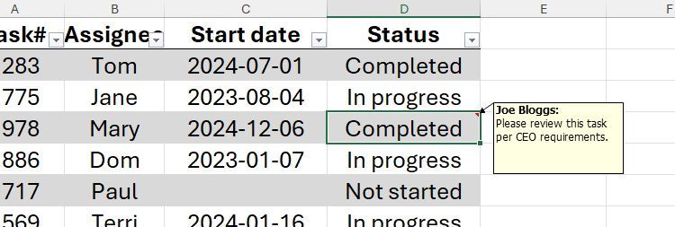 Trong bảng tính này, giả sử bạn đã thêm ghi chú vào một ô để chỉ ra rằng có một nhiệm vụ cần được chú ý thêm.
