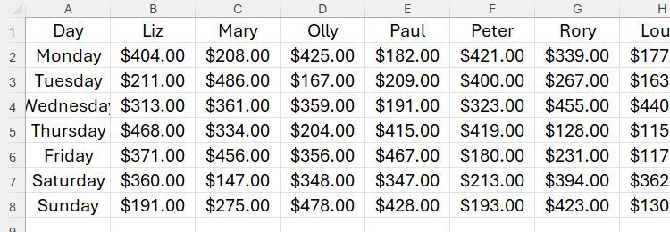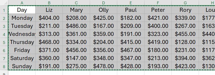 Trong ví dụ này, hãy tưởng tượng bạn nhận được bảng tính này và muốn hoán đổi tên ở hàng 1 với các ngày trong tuần ở cột A, vì các trường phải nằm trong các cột và bản ghi phải nằm trong các hàng.