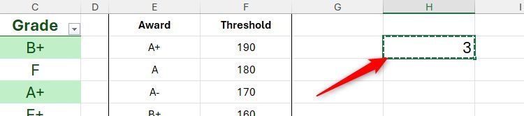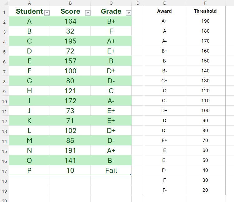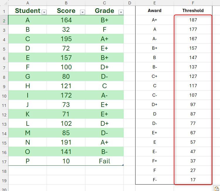 Trong ví dụ này, giả sử bạn đã sử dụng XLOOKUP để trả về điểm của học sinh dựa trên ngưỡng trong bảng tra cứu.