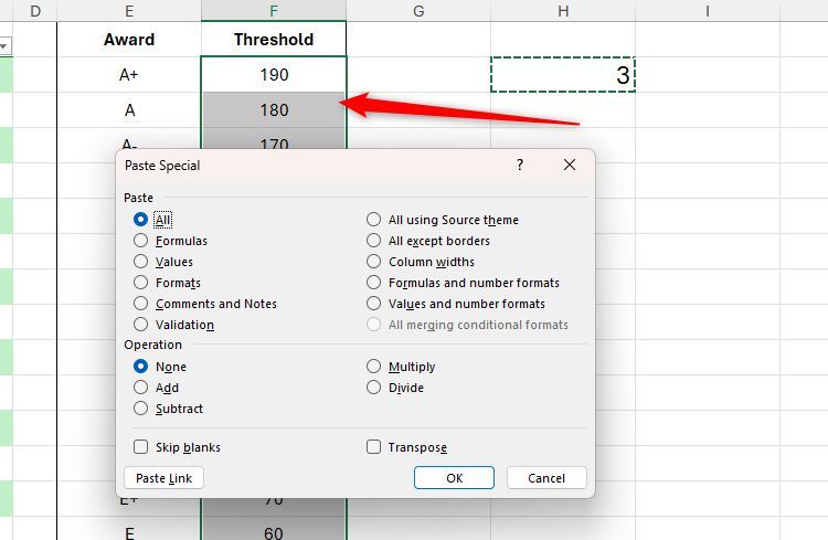 Tiếp theo, với ô có ảnh hưởng vẫn được sao chép, hãy chọn tất cả các ô chứa giá trị bạn muốn tăng hoặc giảm và nhấn Ctrl+Alt+V để khởi chạy hộp thoại Dán đặc biệt.