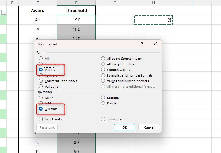 Bây giờ, hãy nhấn các phím tương ứng với các ký tự gạch chân trong các hành động bạn muốn thực hiện. Trong trường hợp này, bạn muốn thực hiện phép trừ, hãy nhấn S và bạn chỉ muốn sao chép giá trị (không phải định dạng), hãy nhấn V.