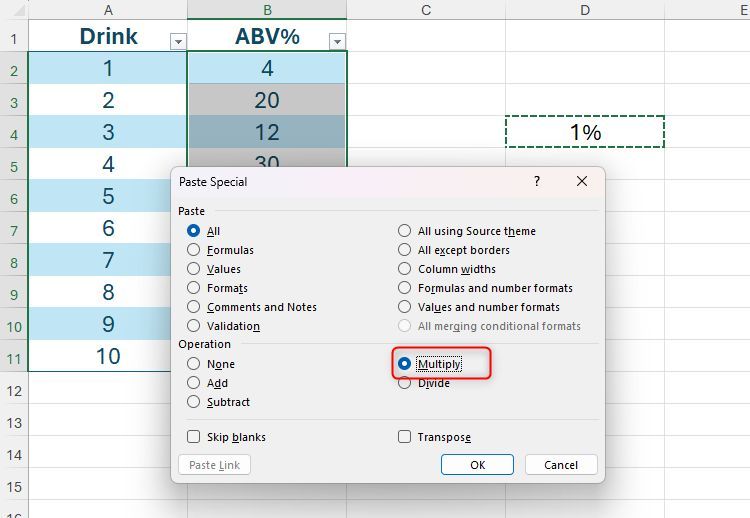 Bây giờ, hãy chọn các ô chứa các giá trị bạn muốn chuyển đổi từ số nguyên sang phần trăm và nhấn Ctrl+Alt+V. Sau đó, nhấn M để kích hoạt phép nhân.