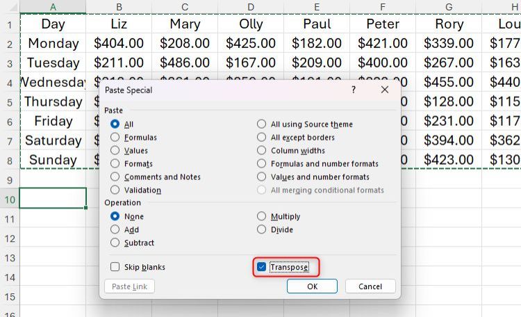 Sau khi mở, nhấn E để kích hoạt hành động chuyển vị. Ngoài ra, hãy kiểm tra lại xem bạn có muốn chọn bất kỳ tùy chọn nào trong phần Dán của hộp thoại hay không—ví dụ, nếu một số ô được định dạng là ngày tháng, hãy nhấn U để giữ nguyên các giá trị và định dạng số của chúng.