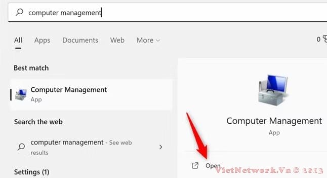 Để truy cập Quản lý đĩa thông qua công cụ Quản lý máy tính, hãy nhấp vào nút Bắt đầu, nhập "Quản lý máy tính" vào thanh tìm kiếm và nhấn Enter hoặc nhấp vào "Mở".