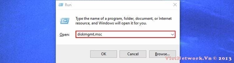 Quản lý đĩa cũng có thể được khởi chạy từ cửa sổ chạy. Nhấn Windows + R, nhập "diskmgmt.msc" vào hộp và sau đó nhấp vào "Ok."