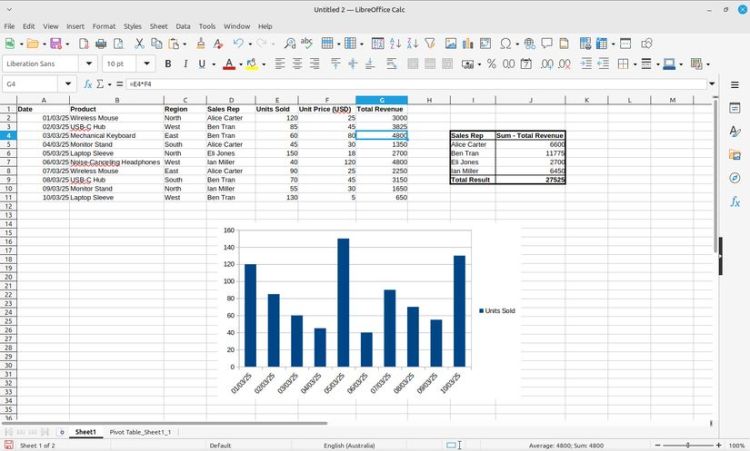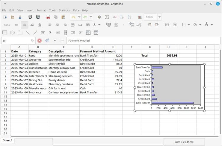 Gnumeric là một công cụ bảng tính mã nguồn mở dành cho Linux. Nó có trong hầu hết các kho lưu trữ mặc định, vì vậy việc cài đặt nó thường chỉ là vấn đề chạy sudo apt install Gnumeric. Nó hỗ trợ các công thức và biểu đồ, và sử dụng Python để viết tập lệnh.