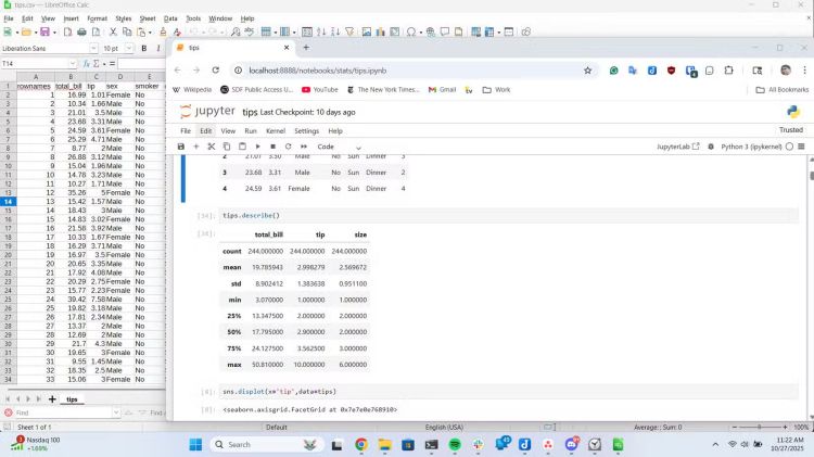 Bạn có thể sử dụng Excel hoặc một chương trình bảng tính khác như LibreOffice Calc để nhập dữ liệu và định dạng, sau đó nhập vào Jupyter bằng Pandas để phân tích và trực quan hóa. Làm việc với dữ liệu theo cách này khuyến khích một phương pháp gọi là phân tích dữ liệu khám phá. Với một thư viện trực quan hóa như Seaborn, bạn có thể nhanh chóng tạo các biểu đồ giúp bạn tìm hiểu sâu hơn về dữ liệu của mình. Các biểu đồ này có thể bao gồm biểu đồ phân tán, biểu đồ hồi quy, biểu đồ histogram và biểu đồ hộp.