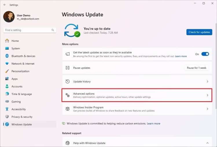 Nhấp vào trang Tùy chọn nâng cao ở bên phải.