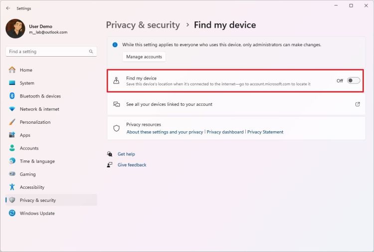 Tắt công tắc  "Tìm thiết bị của tôi" .