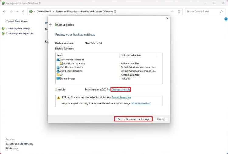 Nếu bạn tiếp tục với cài đặt mặc định, hệ thống sẽ chạy bản sao lưu hàng tuần, vào Chủ Nhật lúc 7 giờ tối, nhưng bạn cũng có thể sử dụng tùy chọn lên lịch để chạy bản sao lưu gia tăng mới hàng ngày vào một thời điểm cụ thể.