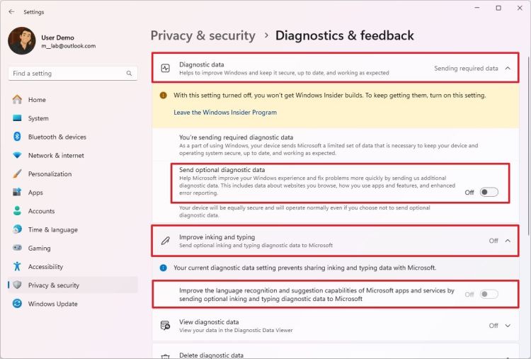 Tắt công tắc chuyển đổi "Gửi dữ liệu chẩn đoán tùy chọn" trong cài đặt "Dữ liệu chẩn đoán".