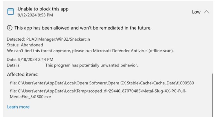 Khi bạn thấy cảnh báo này, hãy vào Settings > Privacy & Security > Windows Security và nhấp vào "Open Windows Security". Sau đó, điều hướng đến tab "Protection History" để xem các mối đe dọa gần đây. Nhấp vào sự kiện mới nhất để mở rộng chi tiết và làm theo các hành động được đề xuất nếu cần thêm các bước. Ngoài ra, hãy tìm hiểu nguồn gốc của mối đe dọa để tránh nguồn gốc trong tương lai.