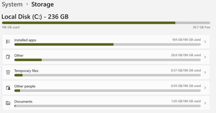 Vì điều này có thể ảnh hưởng nghiêm trọng đến hiệu suất và độ ổn định, bạn nên nghiêm túc xem xét cảnh báo này và giải phóng dung lượng. Để thực hiện, hãy vào Cài đặt > Hệ thống > Lưu trữ để kiểm tra những gì đang sử dụng nhiều dung lượng nhất. Bạn có thể xóa các tệp tạm thời, gỡ cài đặt các ứng dụng không sử dụng, làm trống Thùng rác hoặc di chuyển các tệp lớn sang ổ đĩa ngoài hoặc lưu trữ đám mây.