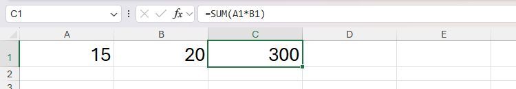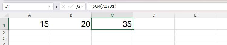 Khi bạn nhập công thức vào Excel và nhấn Enter, ô sẽ hiển thị kết quả và thanh công thức sẽ hiển thị cách bạn có được kết quả đó. Trong ví dụ này, ô C1 hiển thị kết quả của công thức SUM cộng giá trị trong ô A1 với giá trị trong ô B1, trong khi thanh công thức hiển thị chính công thức đó.