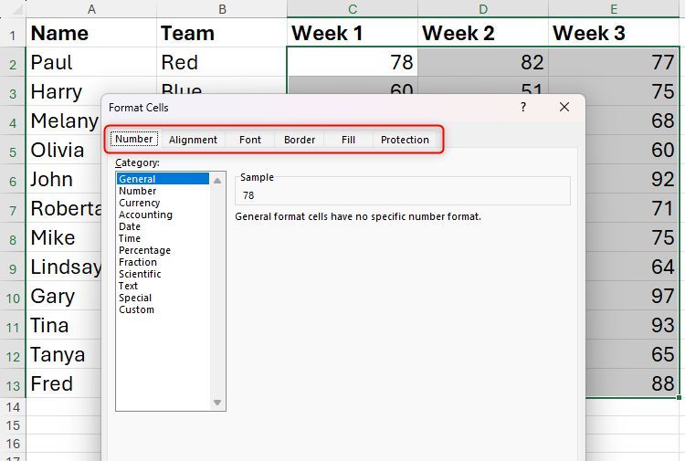Sau khi chọn ô hoặc các ô bạn muốn định dạng và nhấn Ctrl+1, hãy sử dụng phím Mũi tên Trái và Phải để chuyển giữa các tab trong hộp thoại Định dạng Ô.