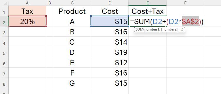 Đầu tiên, F4 cho phép bạn chuyển đổi giữa các tham chiếu tương đối, tuyệt đối và hỗn hợp trong công thức để sửa hoặc bỏ sửa các tham chiếu đến một số ô, cột hoặc hàng nhất định. Trong ví dụ này, tôi nhấn F4 sau khi nhập tham chiếu đến ô A2 trong công thức của mình để thêm ký hiệu đô la ($), buộc Excel phải sửa tham chiếu này khi cuối cùng tôi sao chép công thức sang các ô khác.