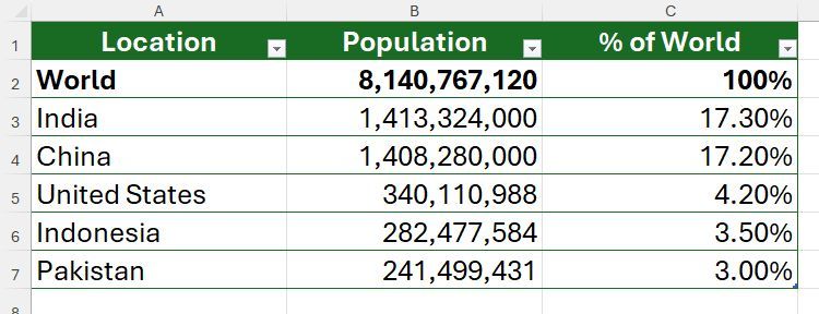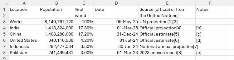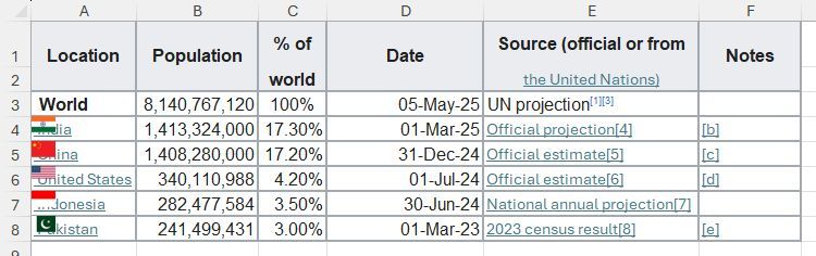 Trong ví dụ này, khi tôi dán năm hàng đầu tiên của một bảng từ trang Wikipedia bằng Ctrl+V, các ô được định dạng không nhất quán, cờ quốc gia che mất tên quốc gia và một số văn bản được liên kết siêu văn bản. Do đó, tôi phải thực hiện các bước bổ sung để xóa định dạng này và sắp xếp lại dữ liệu.