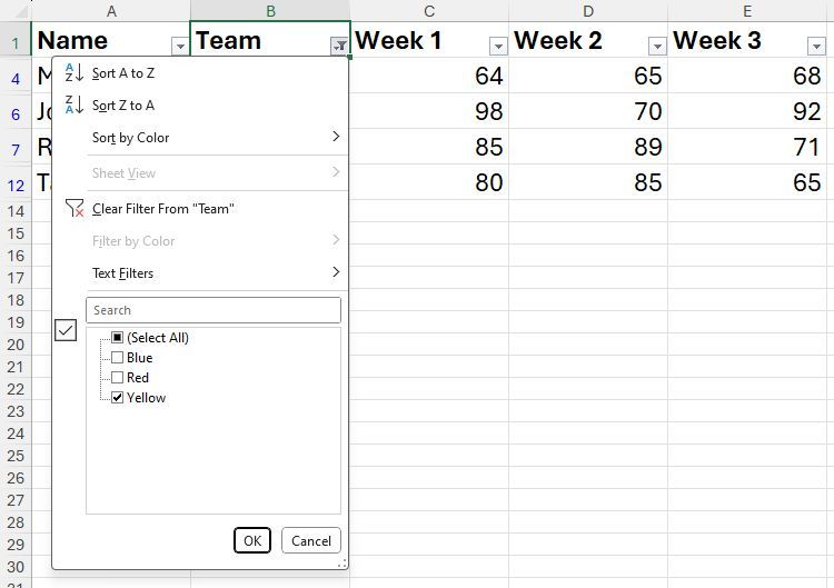 Sau đó, nhấn Ctrl+Up để nhảy đến hàng tiêu đề chứa các bộ lọc, sử dụng phím Mũi tên Trái và Phải để điều hướng đến cột bạn muốn lọc và nhấn Alt+Down để khởi chạy các tùy chọn lọc.