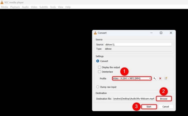Nếu bạn muốn ghi lại nguồn cấp dữ liệu webcam của mình, thay vì nhấp vào Phát trên cửa sổ Mở phương tiện, hãy nhấp vào biểu tượng mũi tên xuống và chọn "Chuyển đổi". Nhấp vào menu thả xuống "Hồ sơ" và chọn đầu ra mong muốn cho tệp video của bạn. Nhấp vào "Duyệt" và chọn nơi bạn muốn lưu tệp. Sau đó, nhấp vào "Bắt đầu".